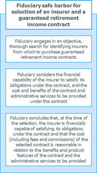 The SECURE Act addresses this uncertainty by specifying optional measures a plan fiduciary can take with respect to selecting an insurer and a guaranteed retirement income contract that will assure the fiduciary has exercised its duties in accordance with ERISA’s prudent expert requirement. These measures provide an optional safe harbor, but do not establish minimum requirements or the exclusive means for satisfying the prudent expert standard. Moreover, the legislation specifies that nothing in these requirements is to be construed to require a fiduciary to select the lowest cost contract. Accordingly, a plan fiduciary may consider the value, including features and benefits of the contract and attributes of the insurer (such as the insurer’s financial strength) in conjunction with the contract’s cost. In a key change from prior law, a fiduciary that satisfies the requirements of the safe harbor will not be liable for any losses that the participant or beneficiary incurs due to the insurer’s inability to satisfy its financial obligations under the terms of the contract following the distribution of, or the investment by or on behalf of a participant or beneficiary pursuant to, the selected guaranteed retirement income contract. This should mitigate plan sponsors’ fear of being exposed to litigation if the insurance company or annuity provider they select becomes insolvent (a risk which plan sponsors may not be capable of fully assessing).