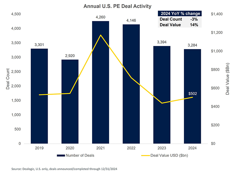 - U.S. PE deal activity: Deal activity was slightly down in 2024 with a 3% YoY decline, while deal value was up 14%. Transaction activity did not make the strong comeback dealmakers were hoping for in 2024 as investors navigated market uncertainty around rate cuts and the 2024 presidential election.