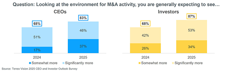 - 2025 M&A expectations: Both CEOs and investors have more favorable outlooks for M&A in 2025 compared to expectations going into 2024.