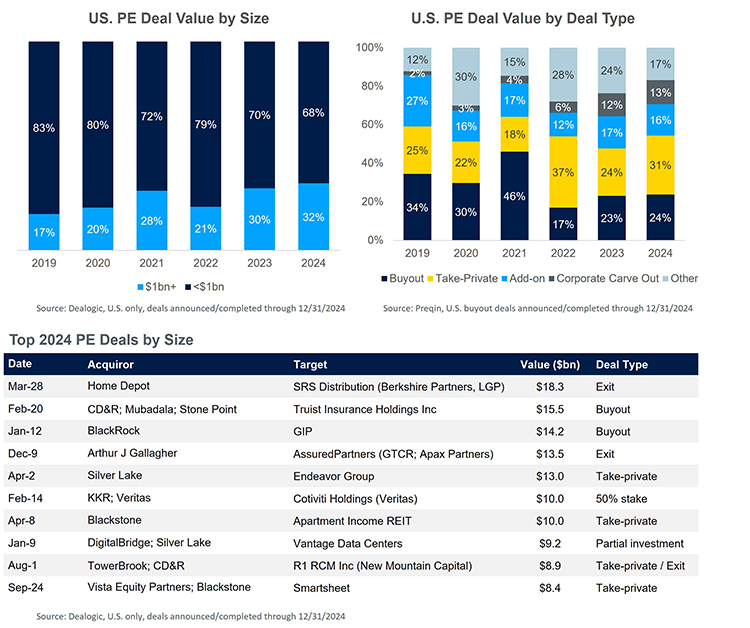 - 2024 deal type trends: Take-private deals grew in popularity as PE firms had high levels of dry powder and jumped on opportunities to acquire companies they deemed undervalued by public markets. Another deal type favored by PE firms in 2024 was corporate carve-outs, a trend expected to continue into 2025.