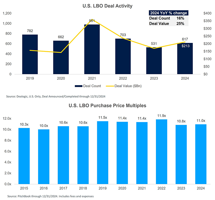 - LBOs pick up: U.S. LBO deal counts and value picked up in 2024 after two consecutive years of decreasing activity. Interest rate cuts and strong financing markets helped to fuel leveraged buyout activity.