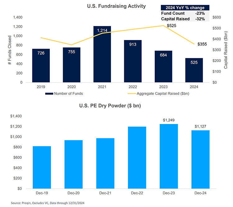 - Major drop in fundraising: Both the number of funds closed and amount of capital raised fell for U.S. PE funds in in 2024 as capital gridlock persisted in the industry.