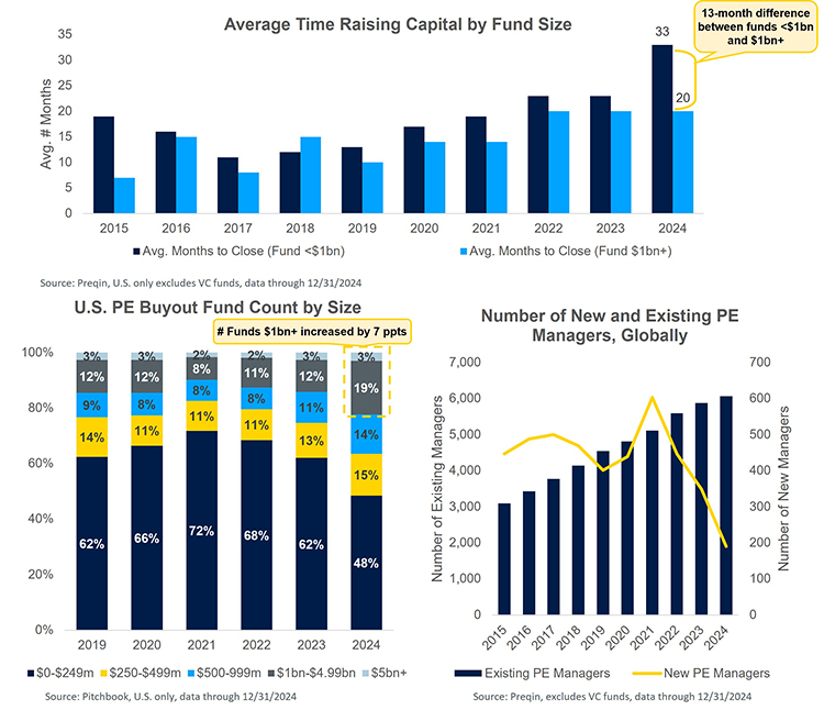 - Longer fundraising cycle: The average length of fundraising jumped from 21 months in 2023 to 27 months in 2024 for all U.S. PE funds. However, funds over $1 billion had an easier time raising capital, taking only 22 months on average to close, while funds under $1 billion took 33 months.