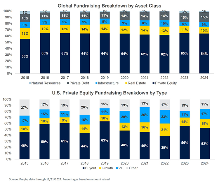 - Fundraising drops: Both the amount of capital raised and number of funds closed fell in 2024 as the fundraising environment continued to face challenges.