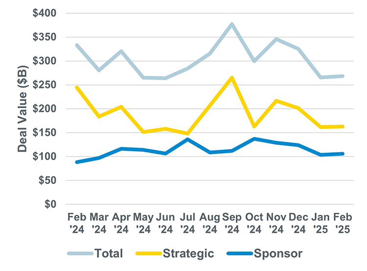Transactions involving strategic buyers in February held steady (up 1%) by deal value from January but declined significantly (34%) year-over-year.