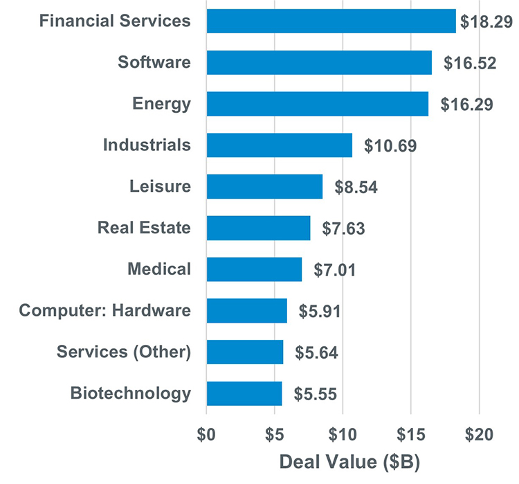- The financial services industry topped the charts by deal value in February, with five announced transactions exceeding $1 billion.