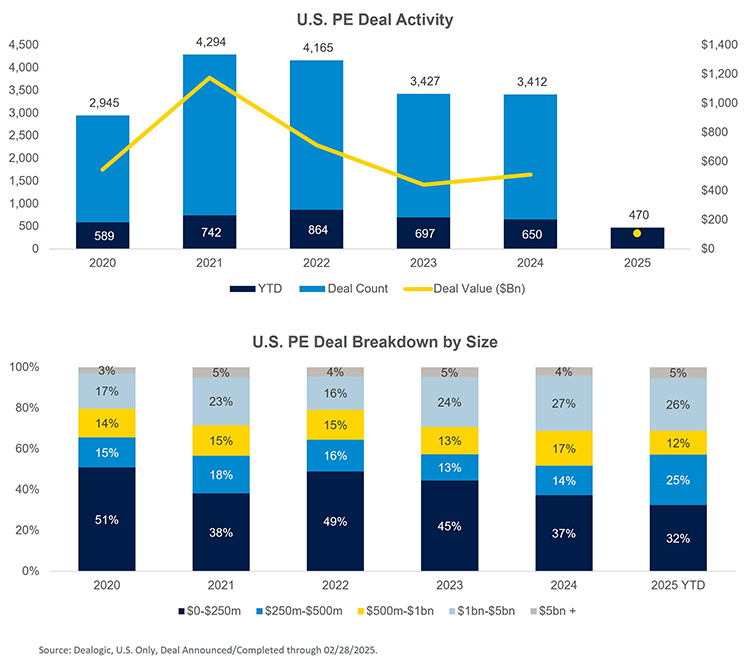 - Deal activity: The first two months of 2025 have seen low levels of U.S. PE deal activity. Deal counts through February are lower than YTD deal counts for the same period in the past 5 years.