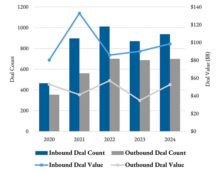 - 2024 outbound Germany M&A activity was up 51% from 2023 by deal value, to $50 billion. By deal count, inbound activity held steady (+2%) in 2024.