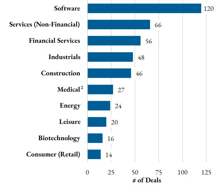 - The software industry fell to second place with only one of the largest 10 deals.